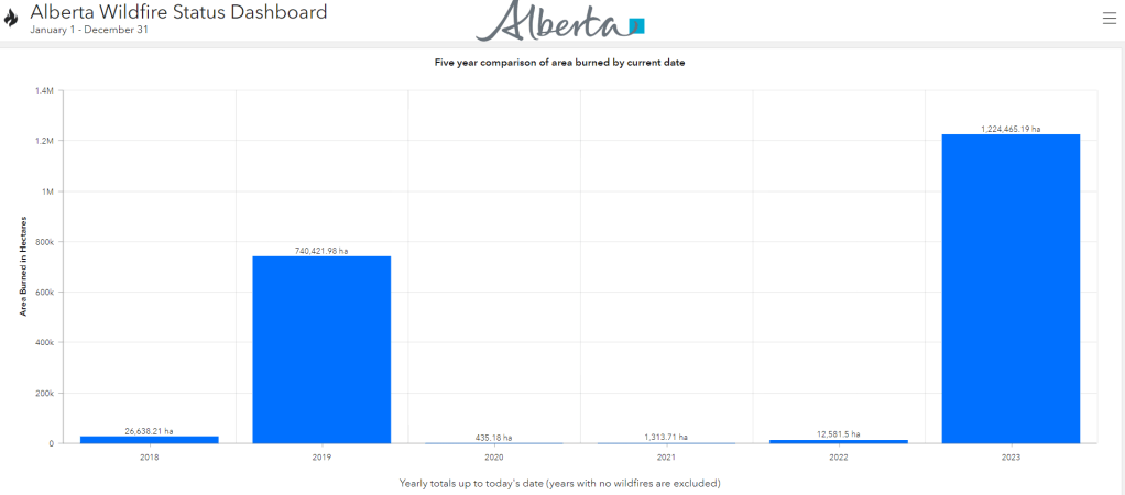 To date, there have been 611 wildfires in Alberta’s ‘forest protection area’ this year. According to Alberta’s Wildfire Dashboard (which regularly updates), over 1.2 million hectares have been burned in this year’s fires.
